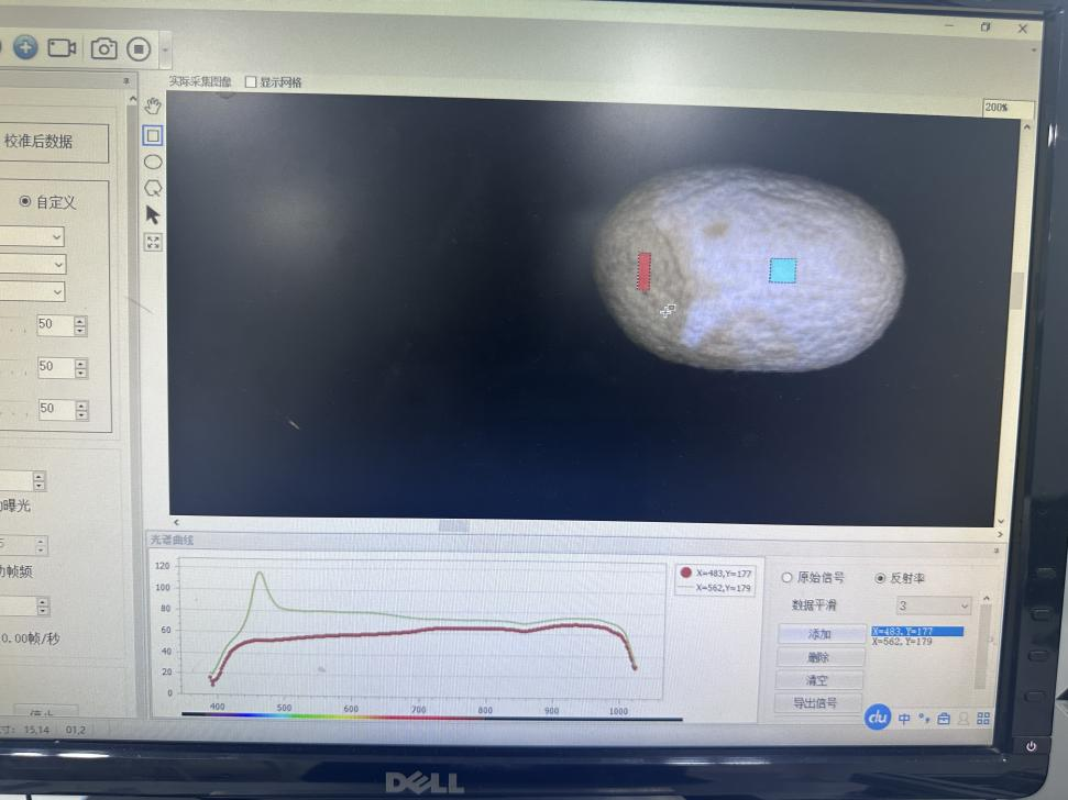 400-1000nm下拍攝結(jié)果,可以看到內(nèi)部蟲體死亡的狀態(tài)下,會(huì)緊緊貼著內(nèi)壁,在燈光照射下,很清晰的就能看到,而正常的蠶繭,則蟲體在內(nèi)部可以四處晃動(dòng),燈光照射無法顯現(xiàn)。通過選擇不同區(qū)域,正常的和黑色區(qū)域,也可以看到其反射光譜曲線有存在差異,400-500納米區(qū)間,無黑斑的地方反射率明顯高一部分,通過后期數(shù)據(jù)建模,可以有效進(jìn)行分別,并且通過面積計(jì)算,也可以更精確的判斷出所占比面積,能更細(xì)化的分別。
