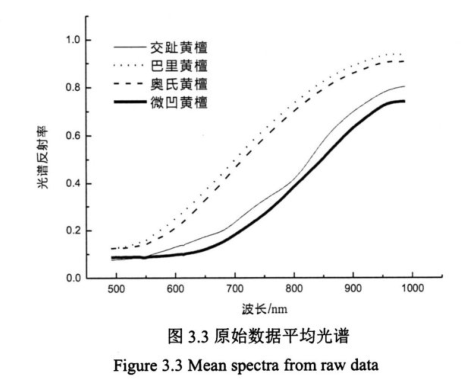 本章節運用高光譜成像技術對光譜范圍在 400-1000nm 的紅酸枝木的光譜和高光譜圖像紋理特征進行分析,并結合多種判別分析模型進行品種識別。綜合分析了多種光譜預處理方法、特征波長選擇方法、紋理特征提取方法和判別模型建立方法,實現了紅酸枝木的無損識別。
