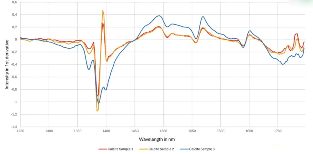 在基于FigSpec高光譜相機FS-17 設備獲取的方解石樣品光譜反射率數據中,通過一階微分處理可有效提取特征信息。研究發現,方解石在 1510 nm 與 1640 nm 處存在顯著的吸收特征峰,該特征可直接用于礦物純度分級的光學分選模型構建。值得注意的是,利用偽彩色圖像可視化技術,即使僅使用短波近紅外(SWIR)波段至 1700 nm 的常規設備,仍可實現礦物純度的有效判別,無需依賴覆蓋至 2500 nm 的高端高光譜成像系統。