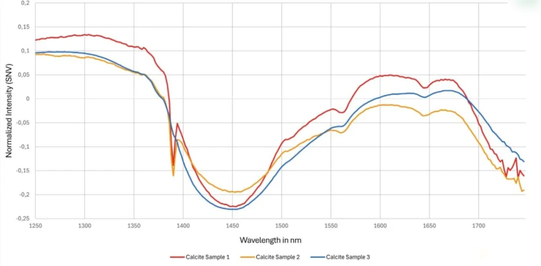使用FigSpec高光譜相機FS-17獲取的不同方解石樣品的光譜強度,采用Insight標準正態變量(SNV); 帶有感興趣區域(ROI)標記;