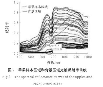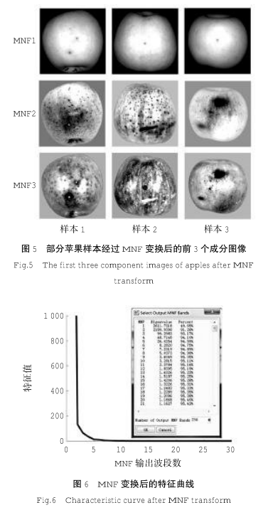 蘋果樣本高光譜圖像經(jīng)過MNF變換后的前15個(gè)波段對(duì)應(yīng)的特征值均大于1.4,且前15個(gè) MNF成分累積百分比超過95.25名,進(jìn)而選取前15個(gè)MNF成分圖像進(jìn)行反向MNF變換,有效地解決了蘋果高光譜圖像中存在的噪聲。完好無損和表面有缺陷蘋果的高光譜圖像的光譜反射率值在700nm~800nm以及900nm~1000nm波段范圍內(nèi)具有明顯的差異,選取717.98nm處的光譜反射率值小于0.6以及982.59nm處的光譜反射率值大于0.52作為區(qū)分蘋果正常區(qū)域和表面缺陷區(qū)域的閾值條件,通過閾值分割方法識(shí)別出表面有缺陷的蘋果,該檢測(cè)方法對(duì)80個(gè)完好無損蘋果和40個(gè)表面有缺陷蘋果的正確識(shí)別率分別為97.58%和95%。實(shí)驗(yàn)結(jié)果為開發(fā)蘋果表面缺陷在線快速檢測(cè)系統(tǒng)提供基礎(chǔ)。